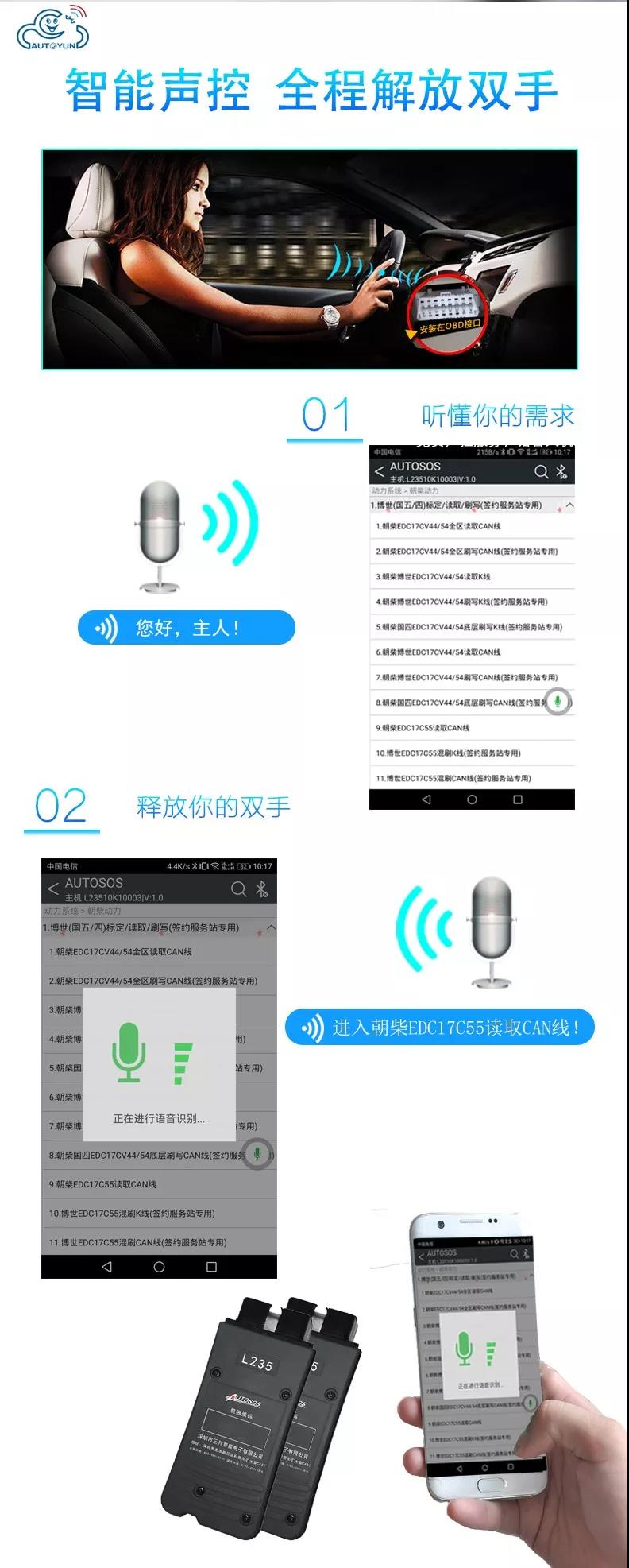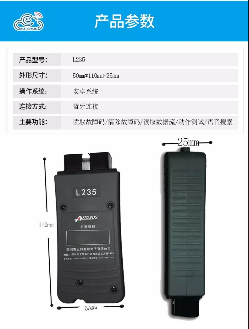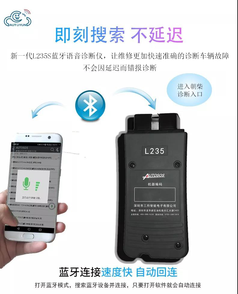 聯(lián)動云L235手機版柴油解碼器是深圳市三羚公司基于手機安卓系統(tǒng)開發(fā)的一款便攜式柴油發(fā)動機故障解碼器,主要適用對象為汽修學徒和運輸公司及車隊司機,聯(lián)動云手機版柴油解碼器可以輕松實現(xiàn)讀取發(fā)動機故障碼,清除發(fā)動機故障碼,讀取發(fā)動機數(shù)據(jù)流,動作測試,元器件測試等諸多實用的功能,是柴油車維修學徒和柴油車駕駛員必不可少的袖珍工具,當你收到聯(lián)動云手機版柴油解碼器可以直接掃碼下載安裝軟件或者撥打客服熱線4009965230。